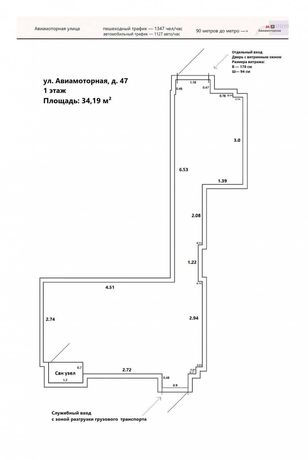 Предлагается в аренду помещение на улице Авиамоторная ЮВАО г.Москвы. Объект расположен на первом этаже жилого дома, находящегося на выходе из метро. До станции метро "Авиамоторная" - 1 минута пешком. Первая линия домов. Дом не входит в программу реновации, в 2018 году проводилась полная реконструкция дома. Густонаселенный жилой массив. Интенсивный пешеходный и автомобильный поток. Проходимость свыше 1000 человек в час. Высокий рекламный потенциал.Электричество 20 кВт. 2 Отдельных входа. Витринная стеклянная дверь. Зона разгрузки-погрузки во дворе.