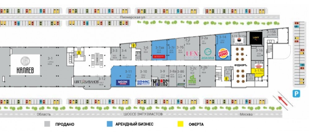 Арендатор - общепит "Бургер Кинг". Месячная арендная плата - 160.000 руб./мес., коммунальные платежи оплачивает арендатор по счетчикам. В ставку включена эксплуатация 230 рублей за 1 кв. м.
