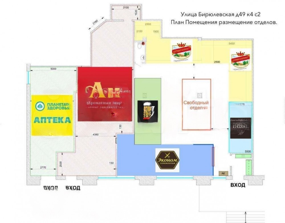 Арендаторы: Аптека, Ароматный мир, Ермолино, Табак, Разливное пиво, Эконом парикмахерская, Овощи, фрукты, сухофрукты. Общий МАП 1 170 000 рублей.