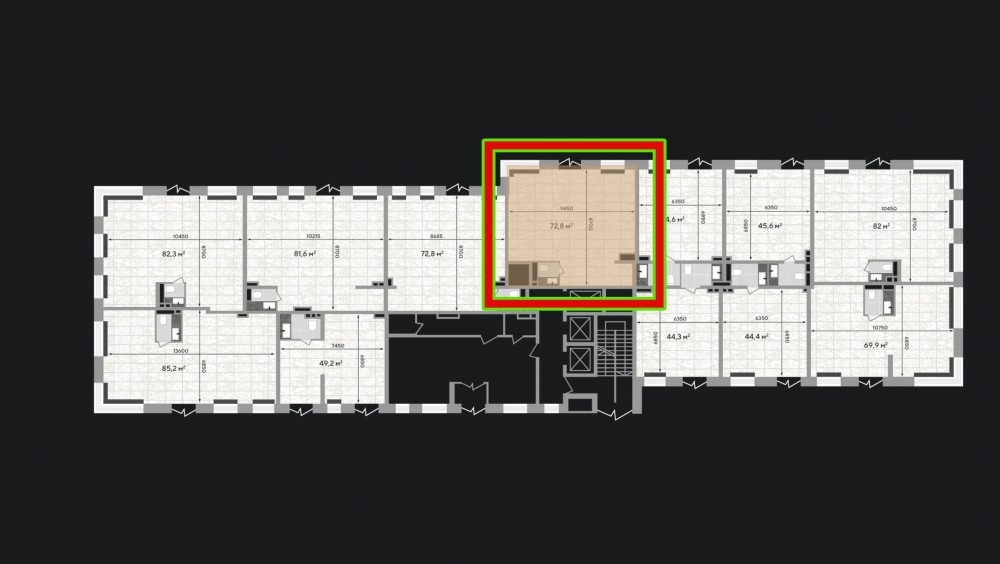 1 этаж 24-ех этажного аппарткомплекса бизнес-класса, площадью 72,8 м². Витринные окна, зальная планировка. Электрическая мощность 18 кВт. Высота потолков 4.5 м.