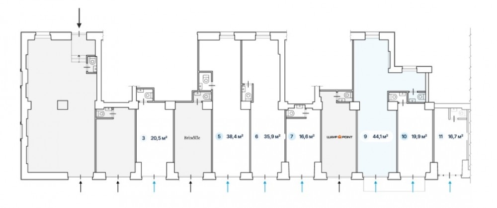 Отдельная входная группа с фасада в каждый блок с 1-й линии.