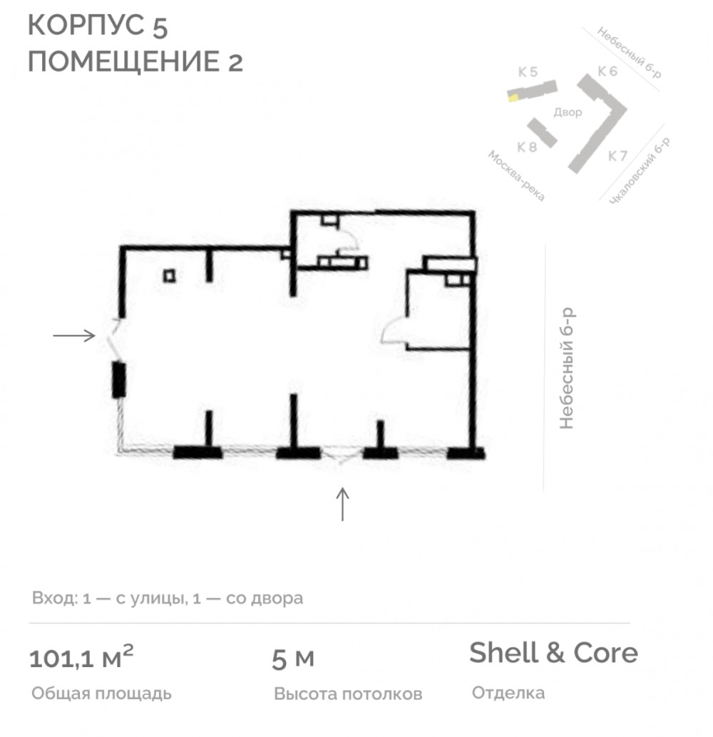 Входная зона с улицы. Витринные окна высотой 5м. В помещениях с черновой отделкой shell & core установлены стеклопакеты, подведены коммуникации и отопление. Стены, пол и потолок готовы к чистовой отделке и оформлению в стиле арендатора.