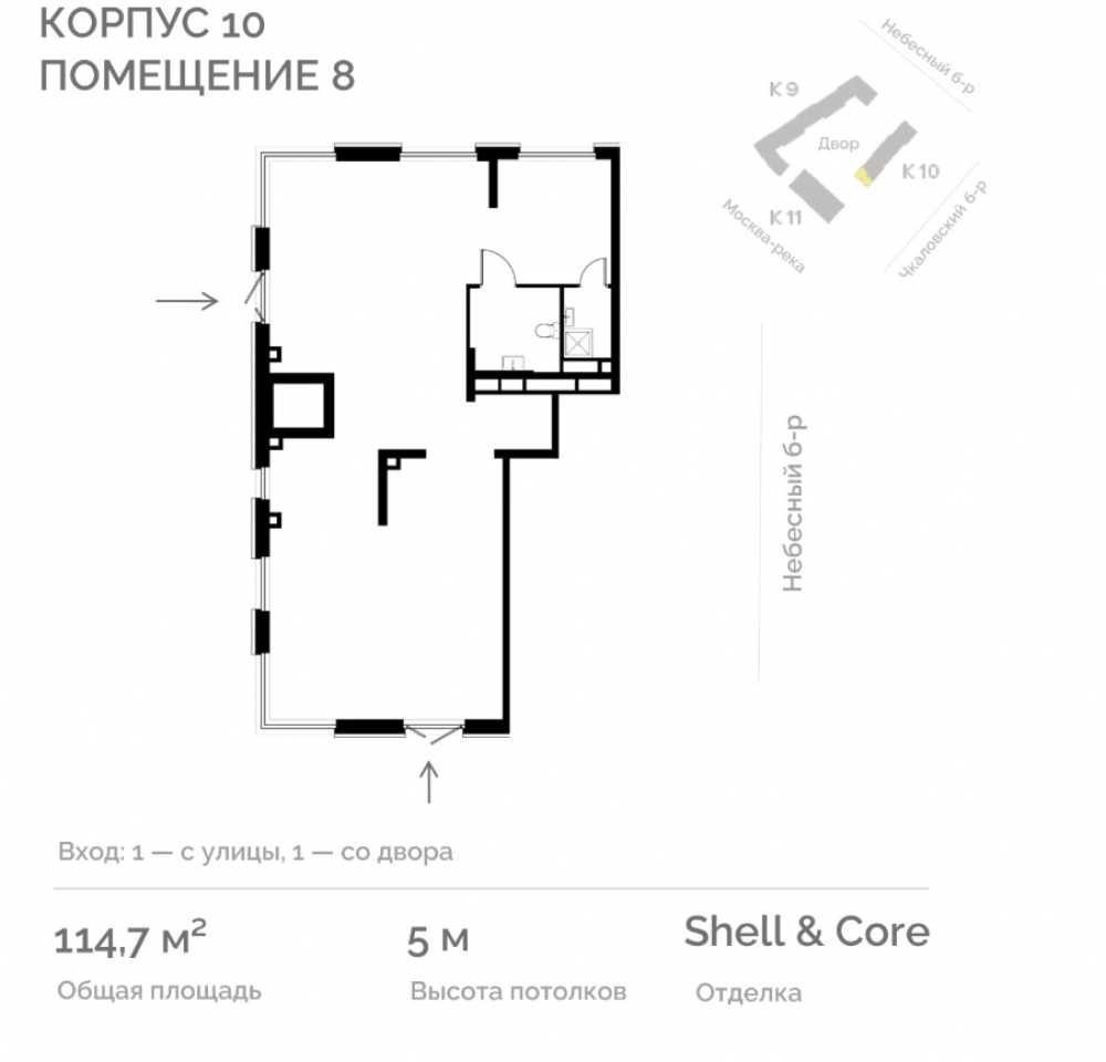 Входная зона с улицы. Витринные окна высотой 5м. В помещениях с черновой отделкой shell & core установлены стеклопакеты, подведены коммуникации и отопление. Стены, пол и потолок готовы к чистовой отделке и оформлению в стиле арендатора.