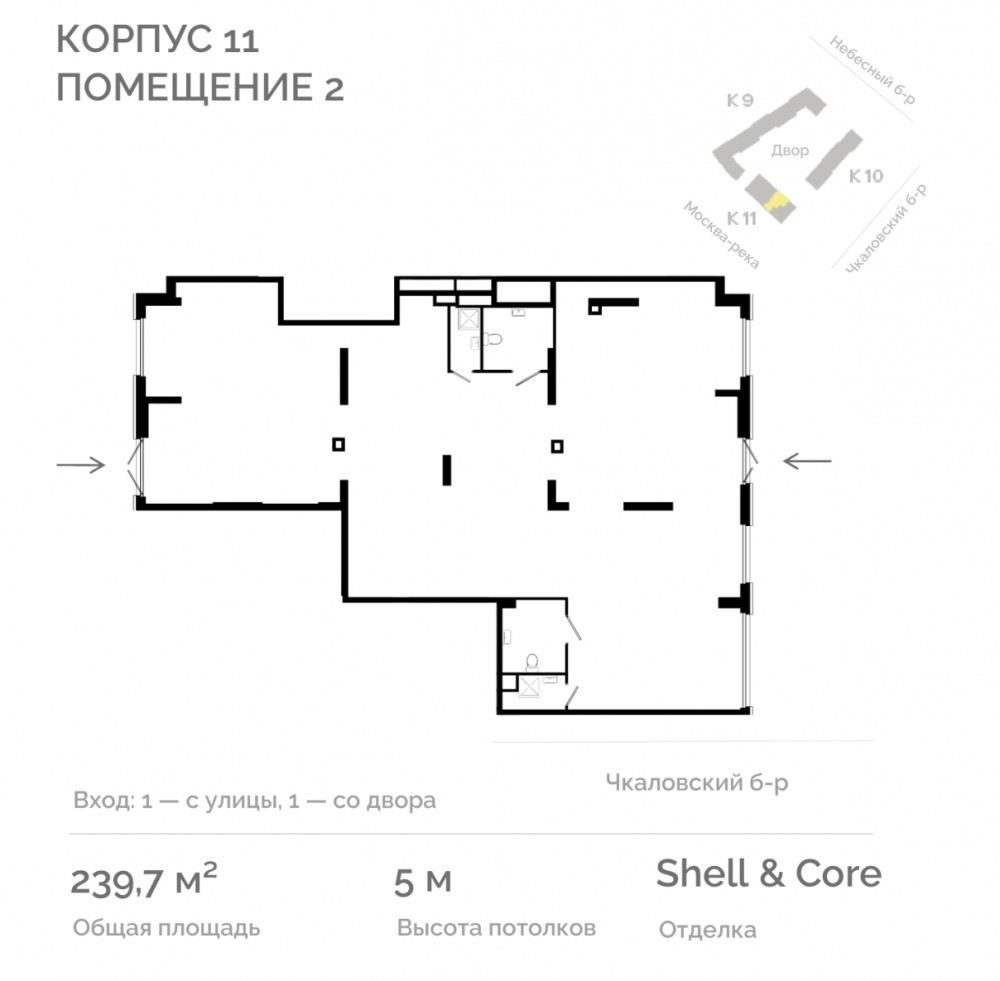 Входная зона с улицы. Витринные окна высотой 5м. В помещениях с черновой отделкой shell & core установлены стеклопакеты, подведены коммуникации и отопление. Стены, пол и потолок готовы к чистовой отделке и оформлению в стиле арендатора.