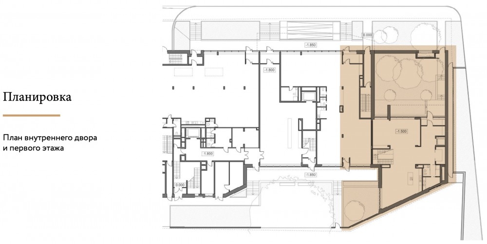- Закрытый внутренний двор с террасой: 200+ м²