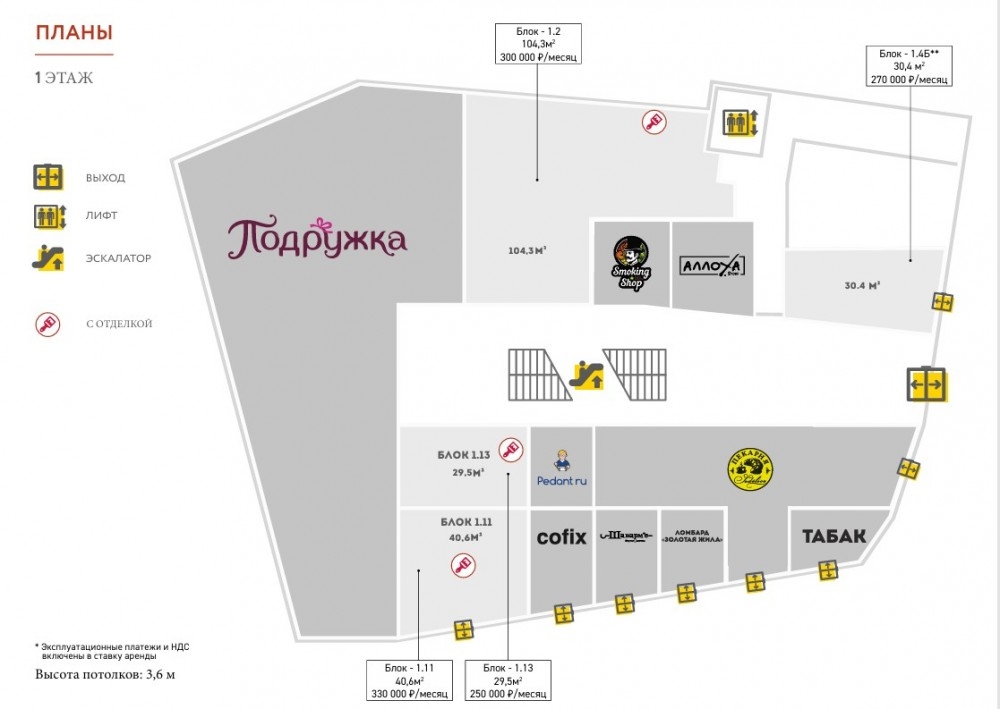 Высокие потолки. Рекламный потенциал. Удобная транспортная доступность. Общая площадь 40.60 м2, 1 этаж, высота потолков 3,60 метров, электрической мощности достаточно. Торговый центр расположен в Восточном административном округе г. Москвы по адресу: Большая Семеновская улица 17А. Расстояние до станции метро «Электрозаводская» — 90 метров, до платформы «Электрозаводская» — 150 м.