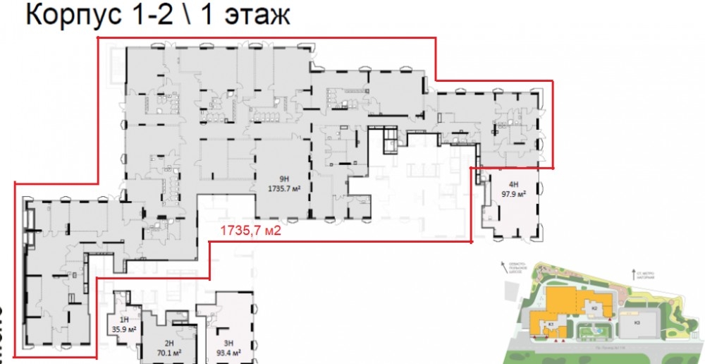 Предлагается в продажу торговое помещение в новом ЖК "Twelve", по адресу: Электролитный проезд, 12Б. Помещение на 1 этаже общей площадью 1 735,70 м2, выделенная электрическая мощность 31 кВт, высота потолков от уровня чистого пола от 4,75 до 5,55 метров. Окна высотой 3,28-3,68 м; подоконник – 0/10/15/20/40 см.
