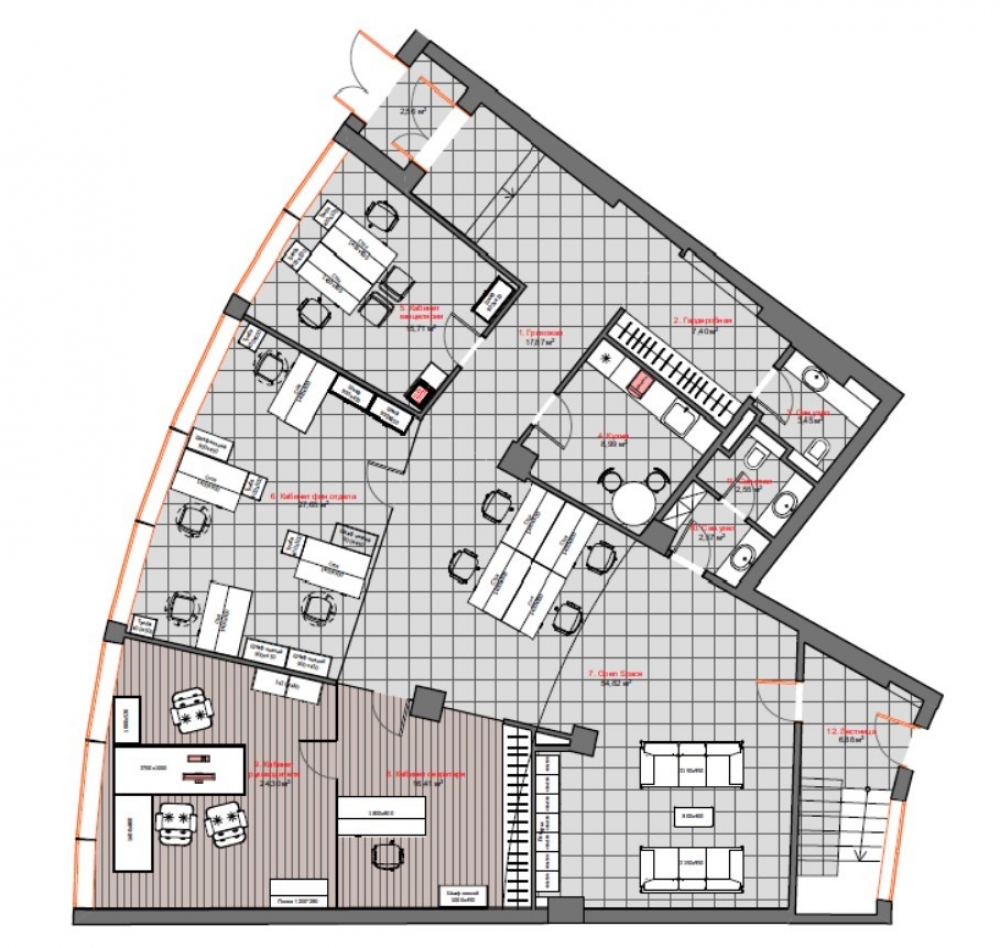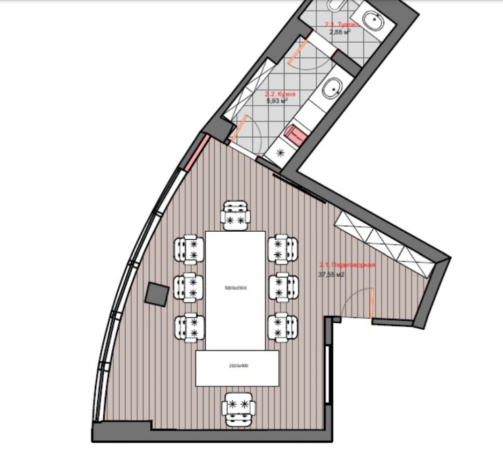 Общая площадь 241,23 кв. м. 1 этаж: 3 кабинета, open space, кухня, переговорная, комната для водителей, 2 санузла. 2 этаж: кабинет (переговорная), кухня, санузел. Панорамное и витражное остекление фасада, высокие потолки, центральное кондиционирование, приточно-вытяжная вентиляция, встроенный индивидуальный тепловой пункт, инженерные системы высокого уровня.