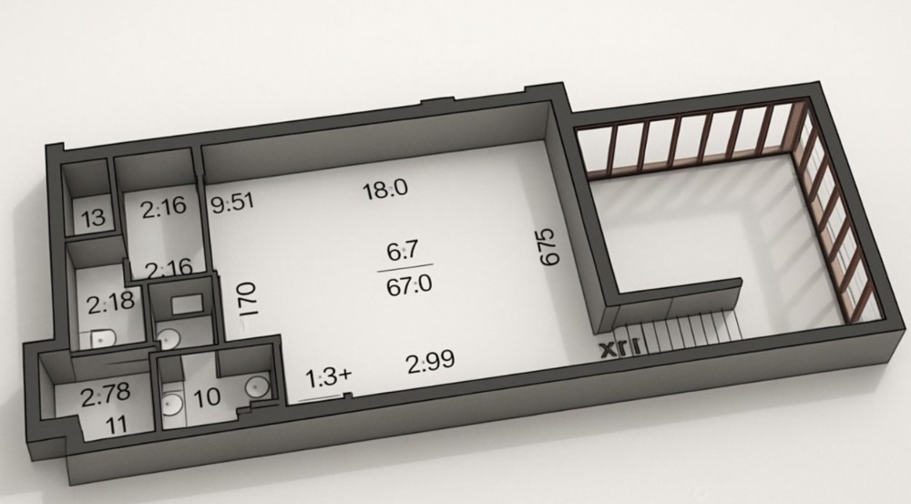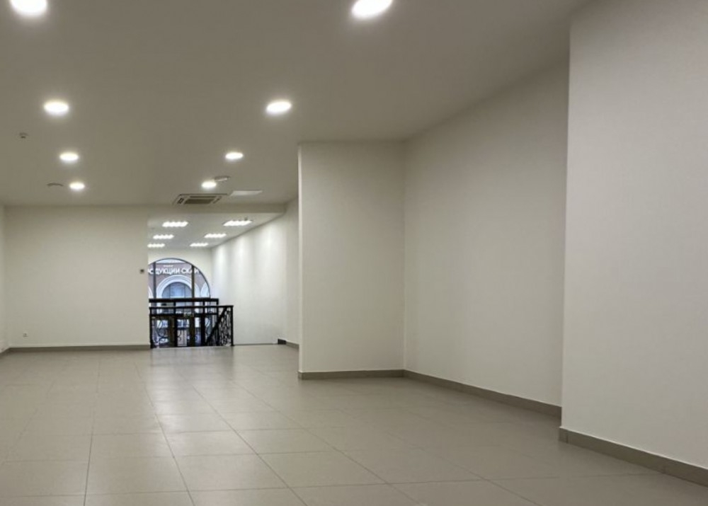 Большой зал и подсобные помещения, на первом этаже потолки 6 метров, на втором 3,5 метра. Большие витринные окна на фасад.