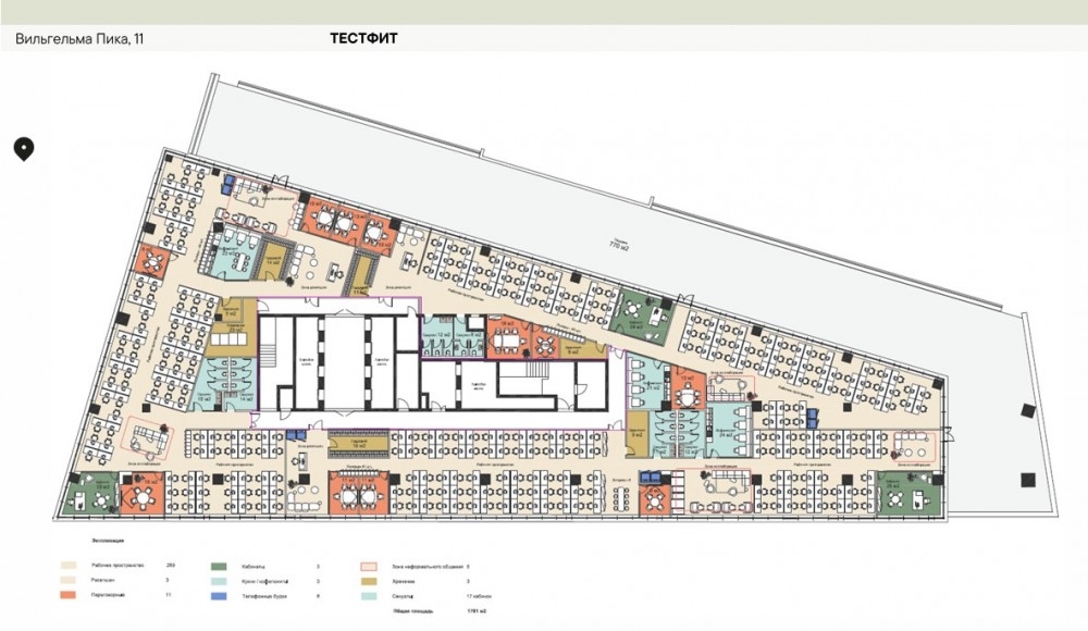 Общая площадь офиса - 2 596 м2, Благодаря правильной планировке уже проработана и визуализирована рассадка на 300 человек с условием соблюдения всех норм и СанПиНов (все предоставим). Окна по всему периметру, а также небольшая глубина этажа - позволяет эффективно делать зонирование по кабинетам, если это будет необходимо.