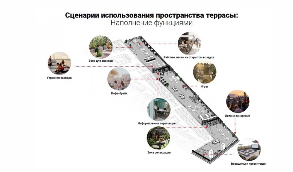 (4 этаж, единственный имеет приватную видовую открытую террасу 800 м2). Терраса также будет в Вашей собственности и имеет ряд бонусов, среди которых возможность организации корпоративных мероприятий, устройство рабочих зон, а также пониженная стоимость услуг по эксплуатации.