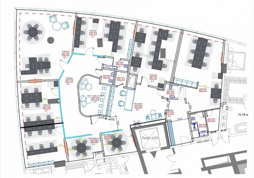 Офис оформлен в современном стиле с использованием премиальных материалов.