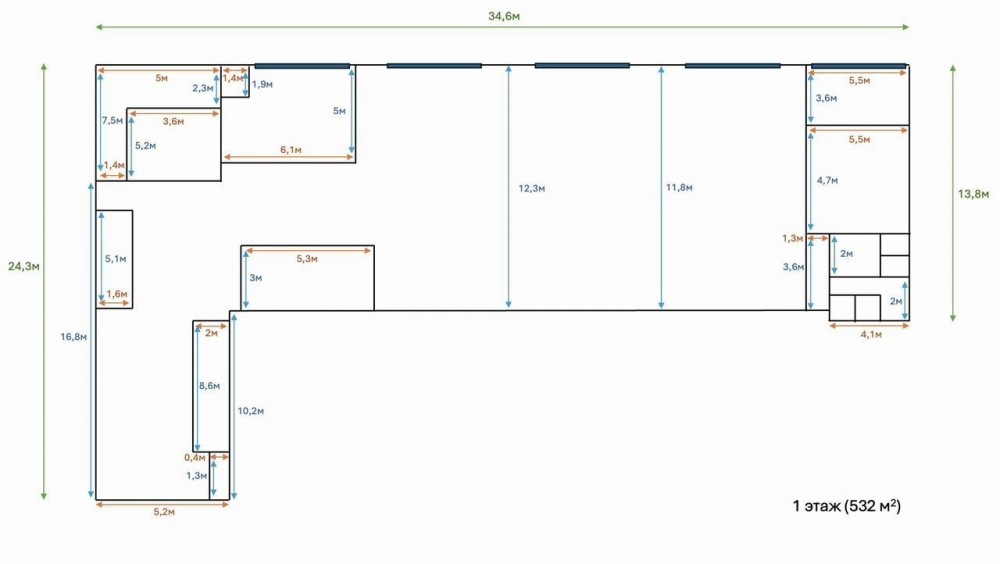 - 1 этаж: 532 м² (производственная зона с возможностью переоборудования под офис)