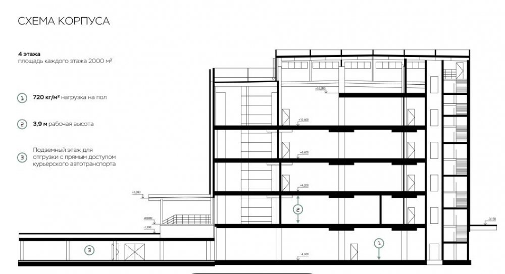 Помещение на 2 этаже, общей площадью 2 000 м2. 8х8м. шаг колонн; Бетонный пол с антипылевым покрытием (720 кг/м² нагрузка на пол). 4 грузовых лифта грузоподъемностью 5 т.; Автоматические секционные ворота. Подземный этаж для отгрузки с прямым доступом курьерского автотранспорта. Пандус для разгрузки малотоннажного транспорта (+0,9 м). Электроснабжение — 2 МВт, II категория.