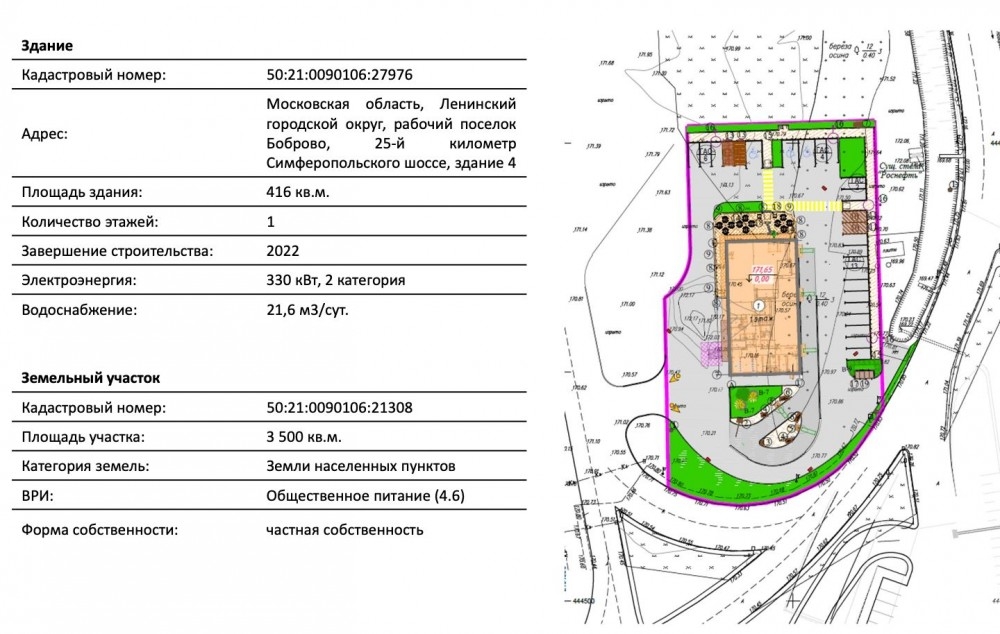 Продажа флагманского ГАБА «Вкусно — и точка» на Симферопольском шоссе. Транзитный поток по федеральной трассе + локальная аудитория (Ленинский округ, жилые кластеры). Видимость с дороги, легкий заезд, парковка. Современное здание 416 м² (сдано в 2022 г., соответствует стандартам франшизы). Участок 3 500 м² в собственности (ВРИ: общепит 4.6 — разрешено расширение). 330 кВт (II кат.), вода 21.6 м³/сутки — запас мощности для роста.