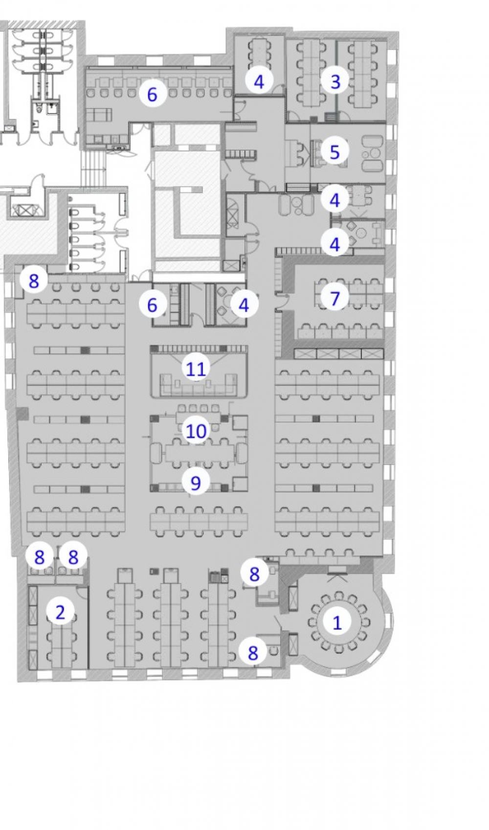 В офисе представлены рабочие зоны с фиксированными и гибкими местами в формате ореn sрасе, а также отдельные офисы, всего 177 рабочих мест. Для встреч и мероприятий предусмотрены полностью оборудованные переговорные комнаты и конференц-зал. Резиденты офиса могут воспользоваться шумоизолированными пространствами для конфиденциальных звонков, зонами отдыха, а также кухнями, оснащёнными всем необходимым.