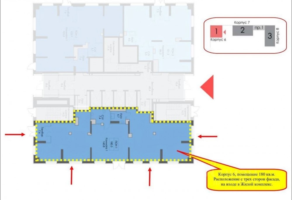 1 линия дома, 1 этаж, большой рекламный потенциал, проходное место.