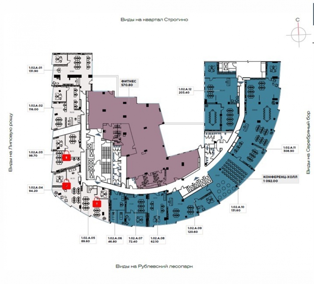 береговой линии Москвы-реки и живописной набережной вдоль Строгинской поймы. Офис площадью 116 м2 расположен на 2 этаже МФК, без отделки, потолки 3,30 м.