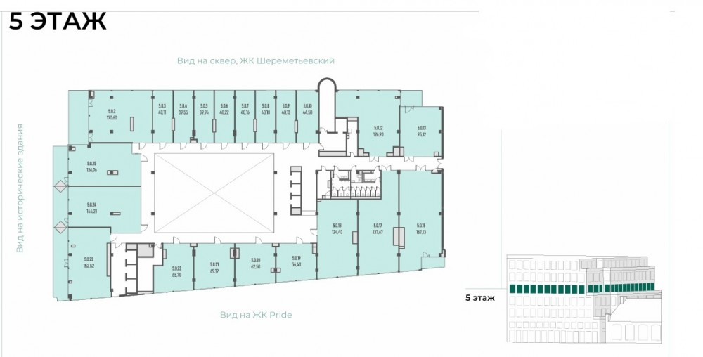 5 этаж площадью 2 266 м2, потолки от 3,3м до 6,85м., электрическая мощность любая. Возможность мокрой точки, VRV-система вентиляции и кондиционирования (подведение фреонопровода к помещению).