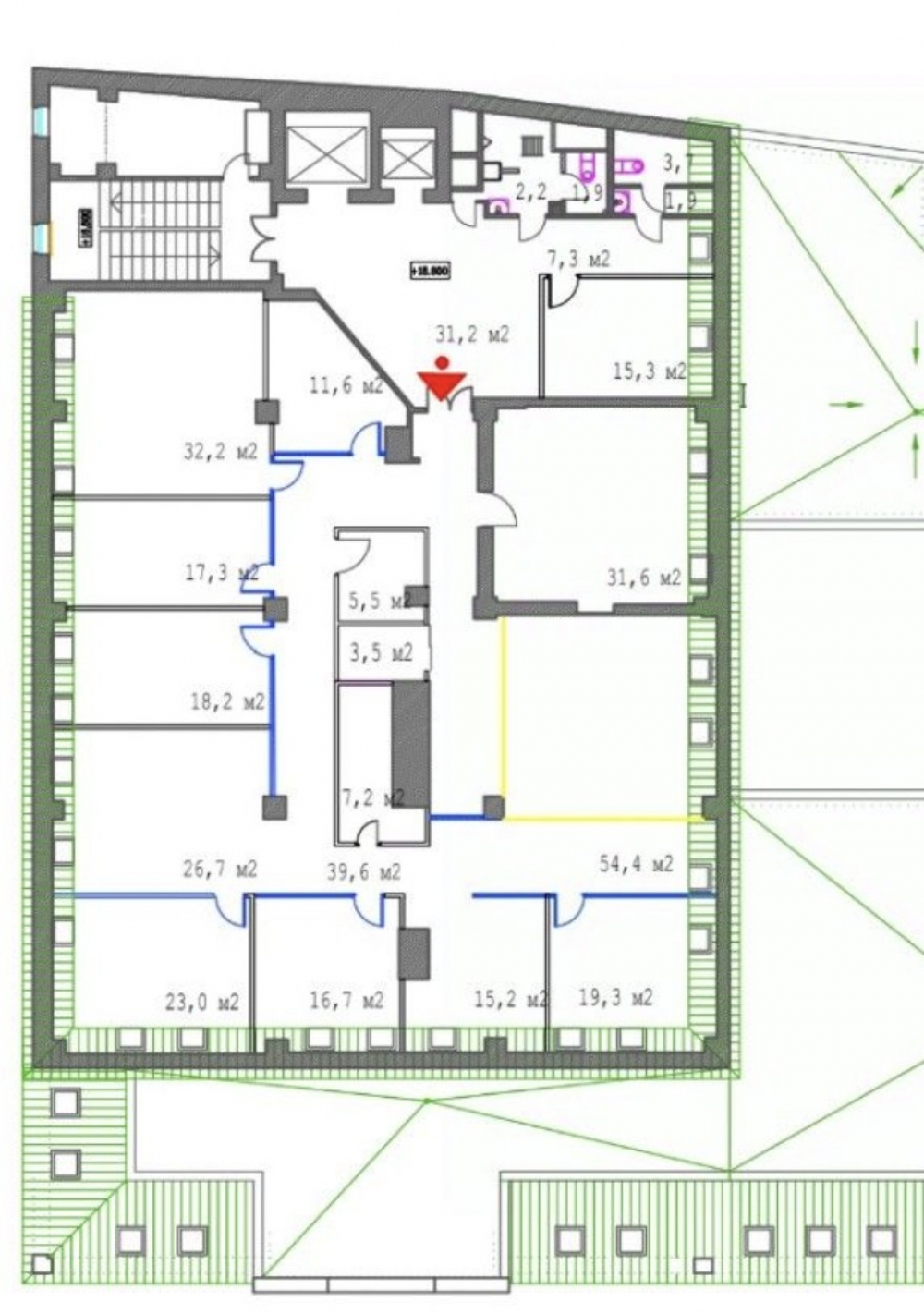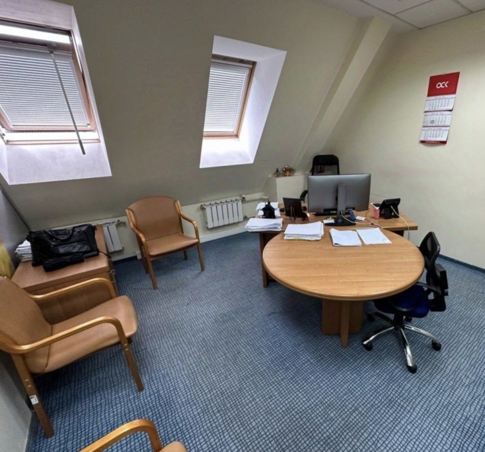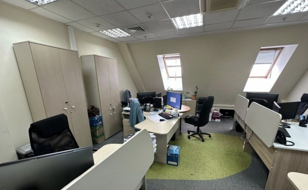 Помещение расположено на шестом (мансардном) этаже, стандартный офисный ремонт, кабинетная планировка, есть своя кухня и с/у. Установлена приточно-вытяжная вентиляция, кондиционирование.