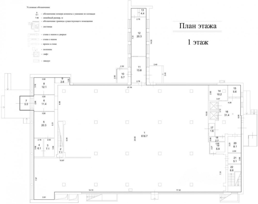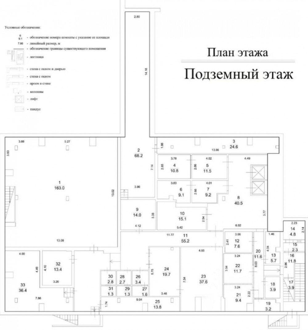 Отдельно-стоящее здание общей площадю 1462 м2: первый этаж 799 м2 с потолками 3,5 м, подвал 644 м2 с потолками 2,4 м2. Установлены 2 грузовых лифта. Ремонт за выездом супермаркета. Выделенная мощность 150 кВт.