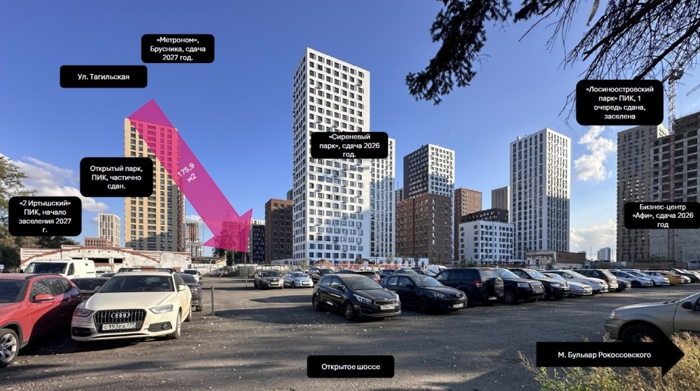 Отлично просматривается с ул. Тагильская – основного заезда на транспорте и пешеходном маршруте от метро к четырем жилым комплексам рядом;