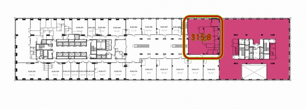 2 этаж 2ух этажного стилобата соединяющего 2 офисные башни высотой 23 и 12 этажей, площадь помещения 315,8 кв.м., первая линия, витринное остекление, открытая планировка, потолки 4 м., электроэнергия 20 кВт (есть техническая возможность для увеличения.