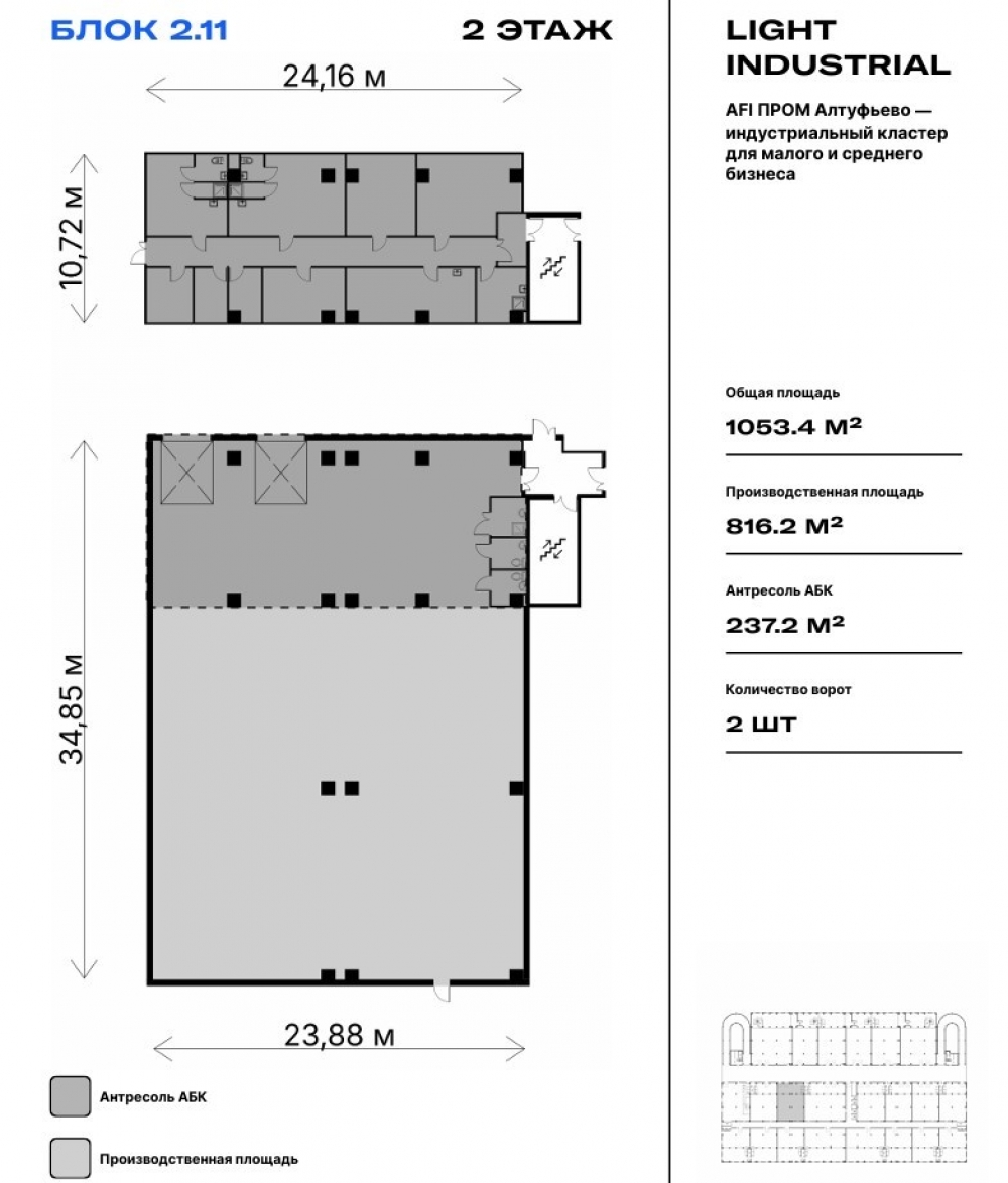 Продажа складского помещения на 2 этаже, площадью 1053.4 м2 в многоэтажном производственном здании формата "Лайт Индастриал" в AFI ПРОМ Алтуфьево