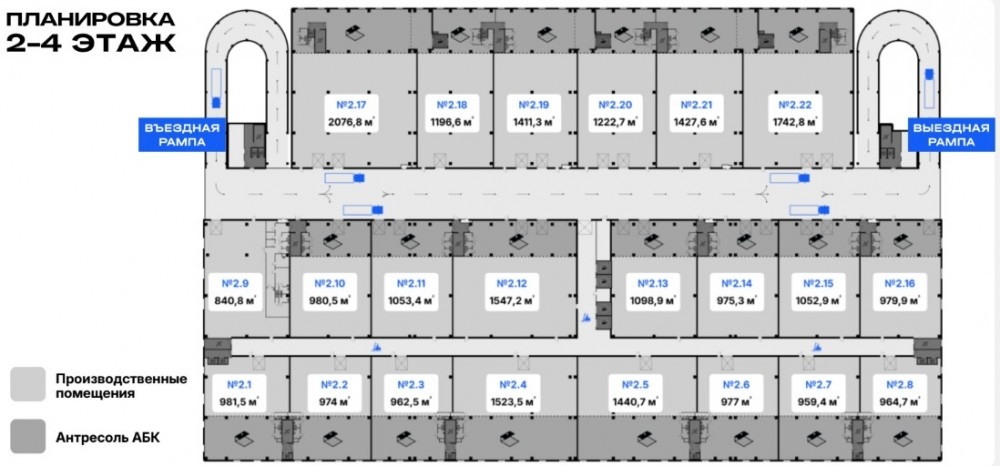 4 производственных этажа соединены автомобильными рампами с доступов среднетоннажного автотранспорта на этаж