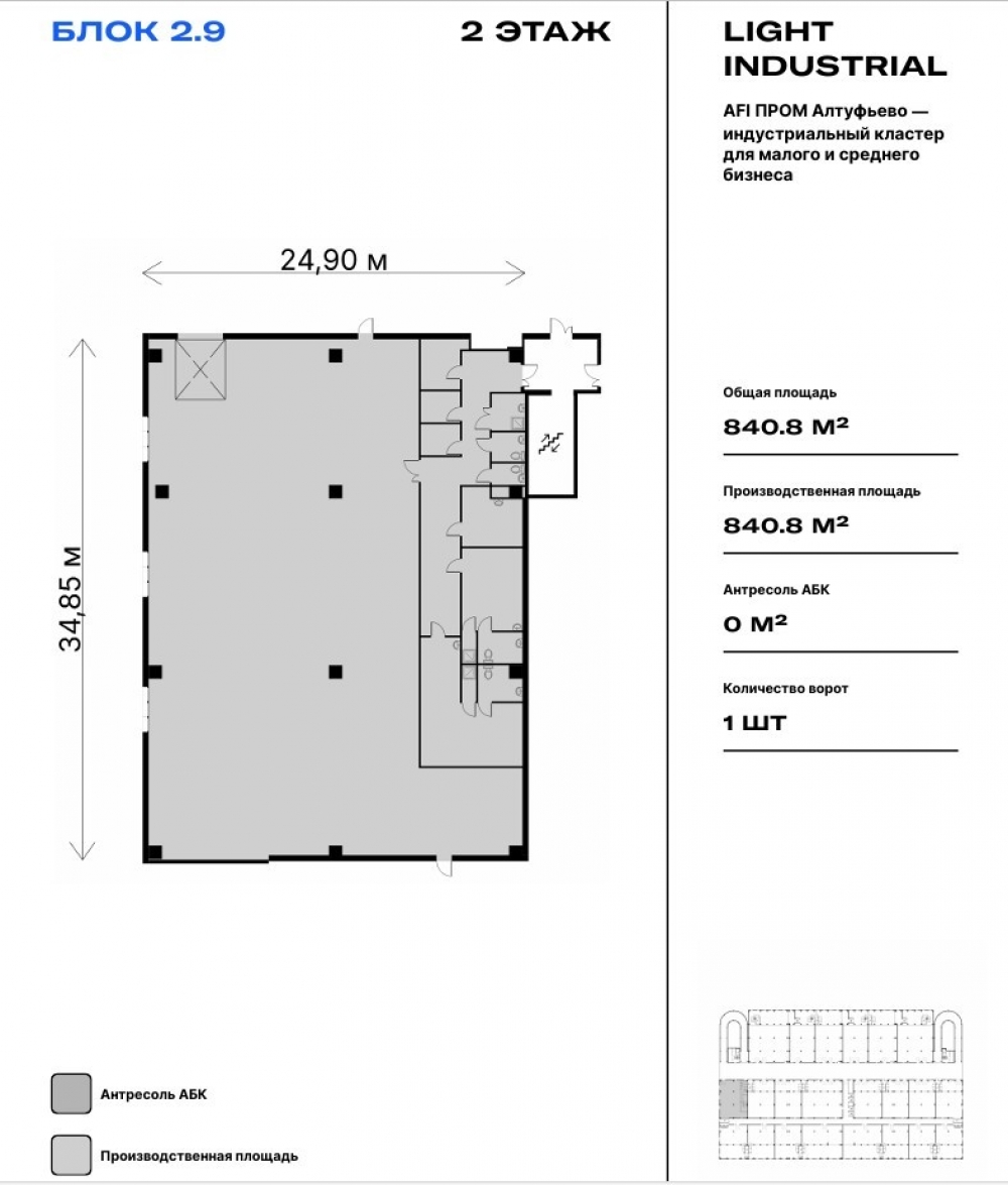 Продажа складского помещения на 2 этаже, площадью 840.8 м2 в многоэтажном производственном здании формата "Лайт Индастриал" в AFI ПРОМ Алтуфьево