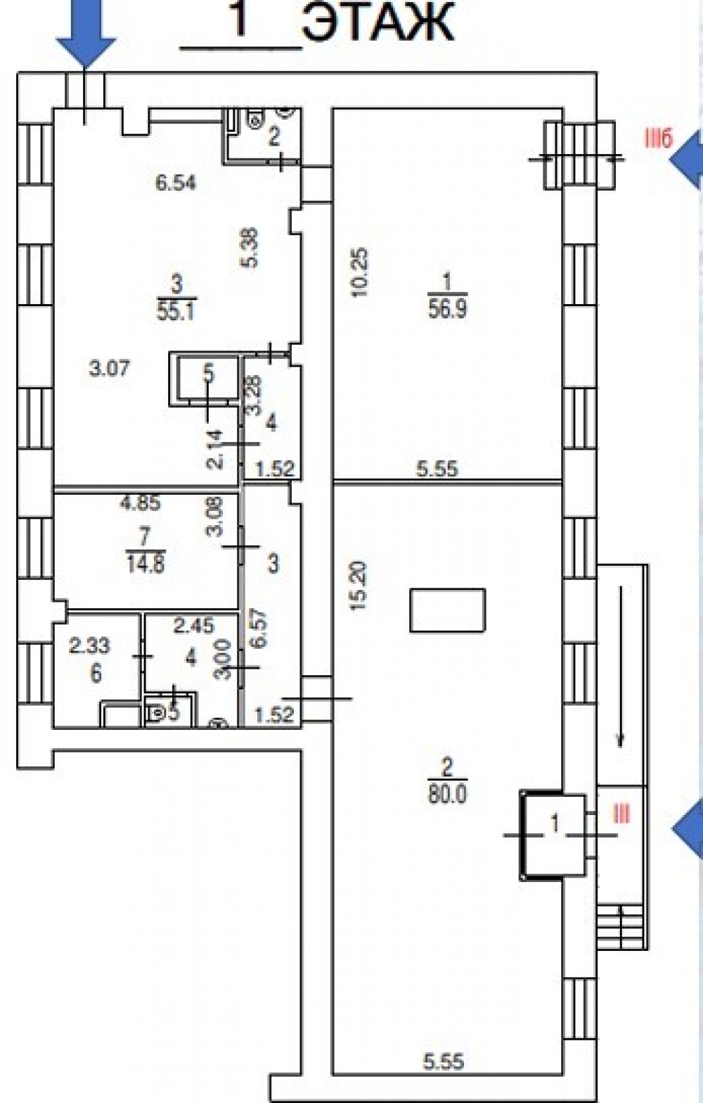 Два отдельных входа с улицы и один с торца здания. Открытая планировка.