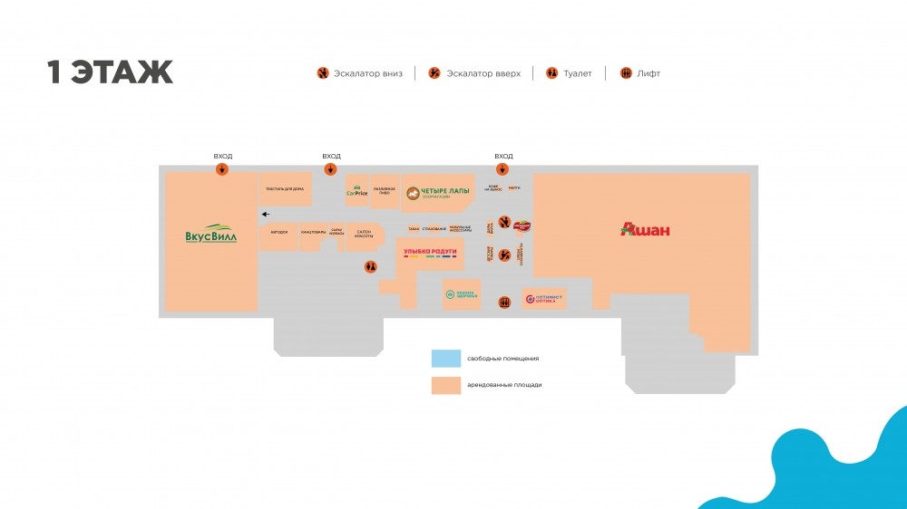 1 этаж – супермаркет Ашан, салон связи, аптека, ресторан-пиццерия, зоомагазин «4 ЛАПЫ», салон красоты.