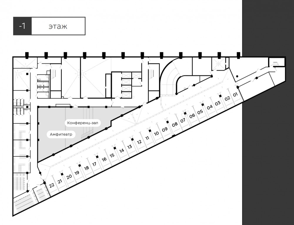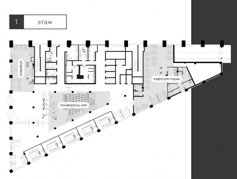 На первом этаже предполагается лобби 469м2 с потолками до 7,6м, ресторан 213м2, кофейня, концеренц-залл на 50 мест, а также до пяти переговорных комнат.