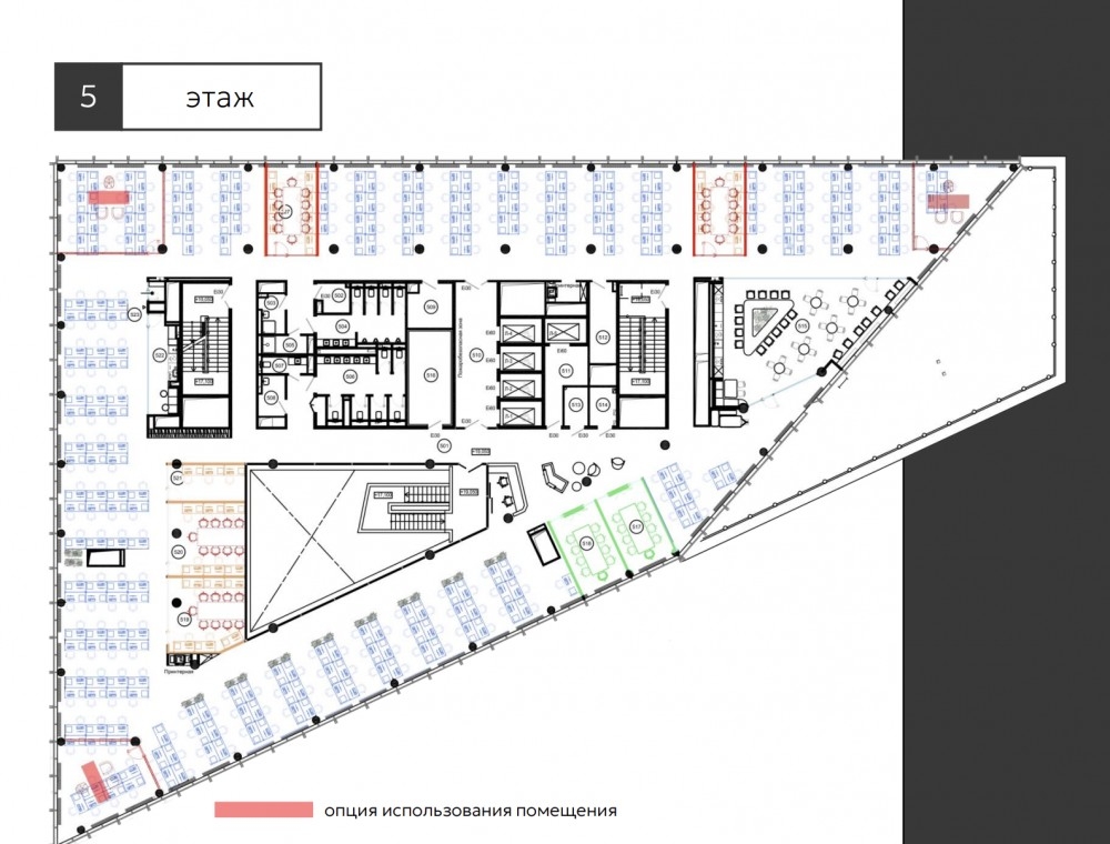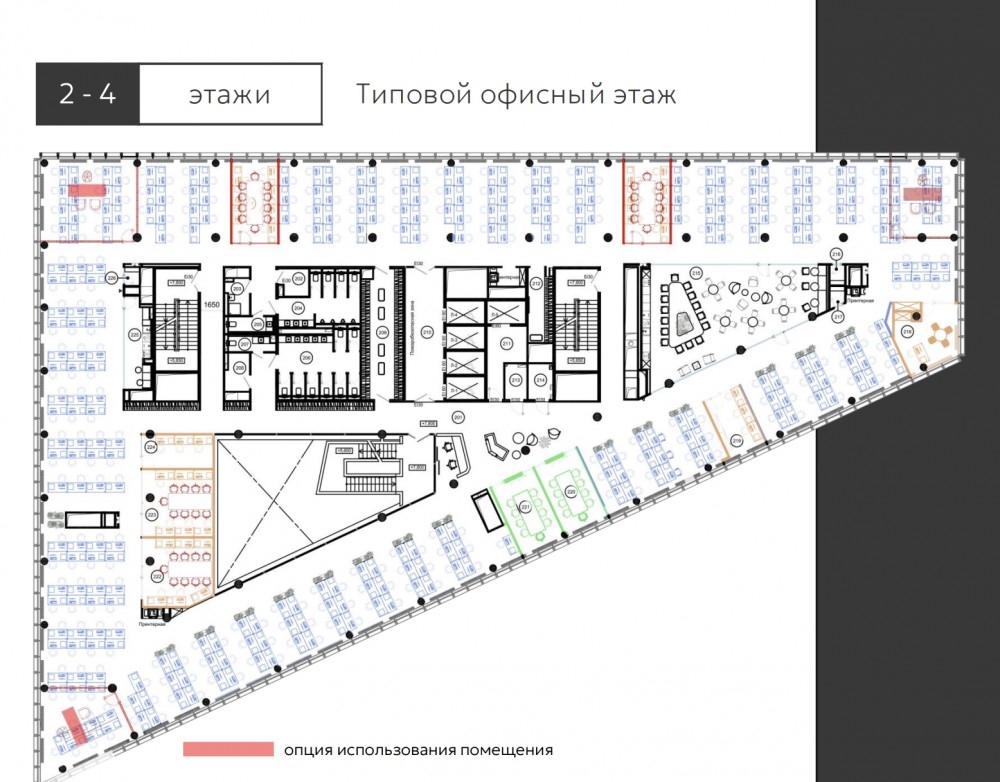 Со второго по пятый этаж располагаются офисные пространства с возможностью размещение до 1450 сотрудников. Также на пятом этаже предусмотрена терраса.