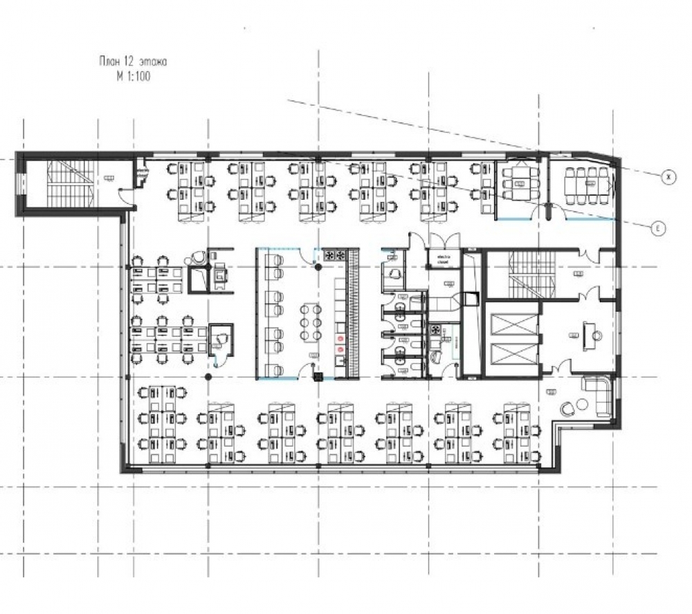 Офис расположен на 12-м этаже, площадь 427м2, смешанная планировка, потолки 4м. Полностью оборудован и меблирован на 64 рабочих места. Установлены системы вентиляции и кондиционирования.