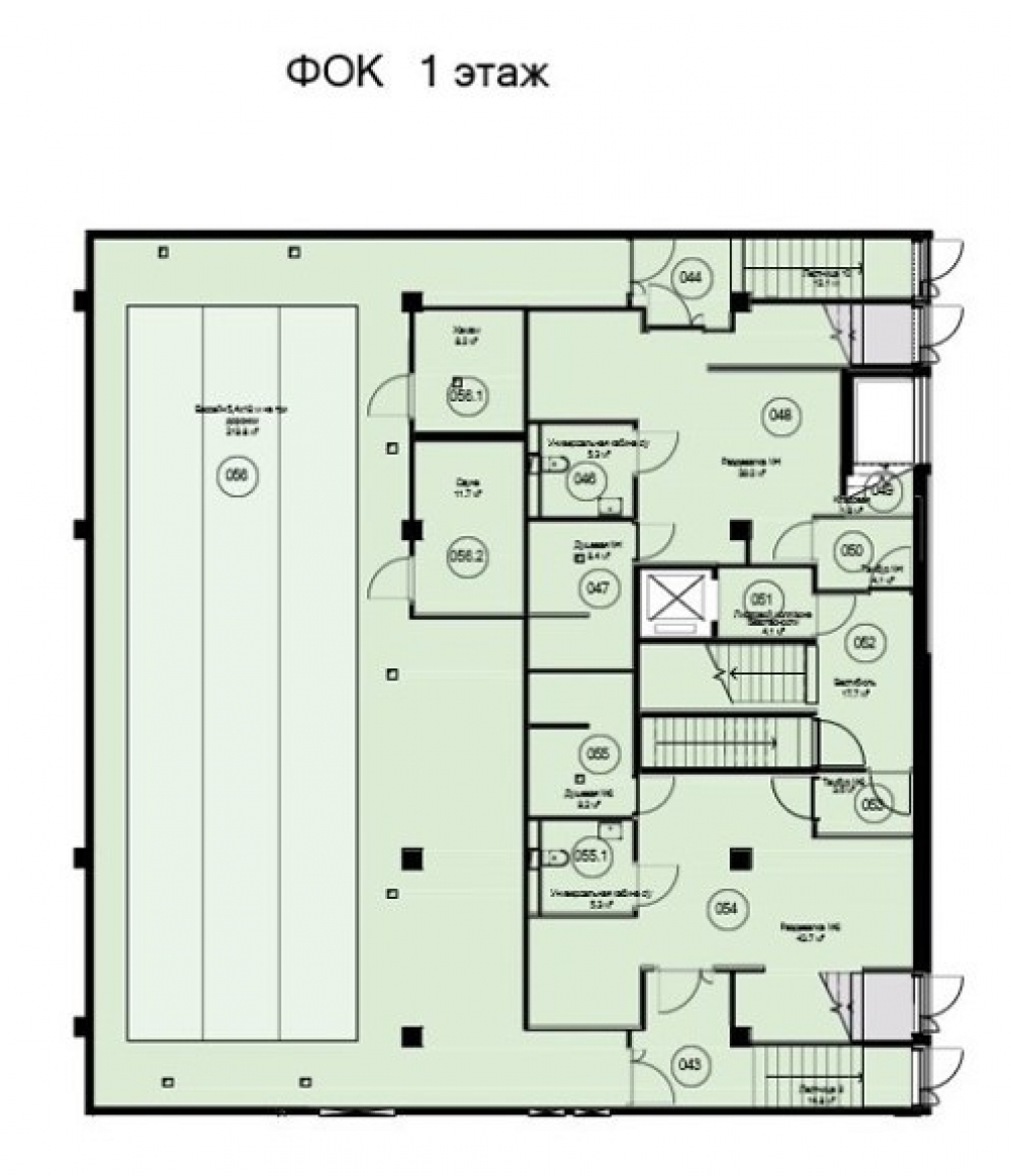 На продажу представлено помещение с назначением ФОК. Оздоровительный комплекс с бассейном, встроенный в стилобатную часть ЖК Либерти. Предусмотрены помещения под сан.узел, душевые, раздевалки, бассейн 5.4 х 18 на три дорожки, хамам, сауна, тренажерный зал и другое.
