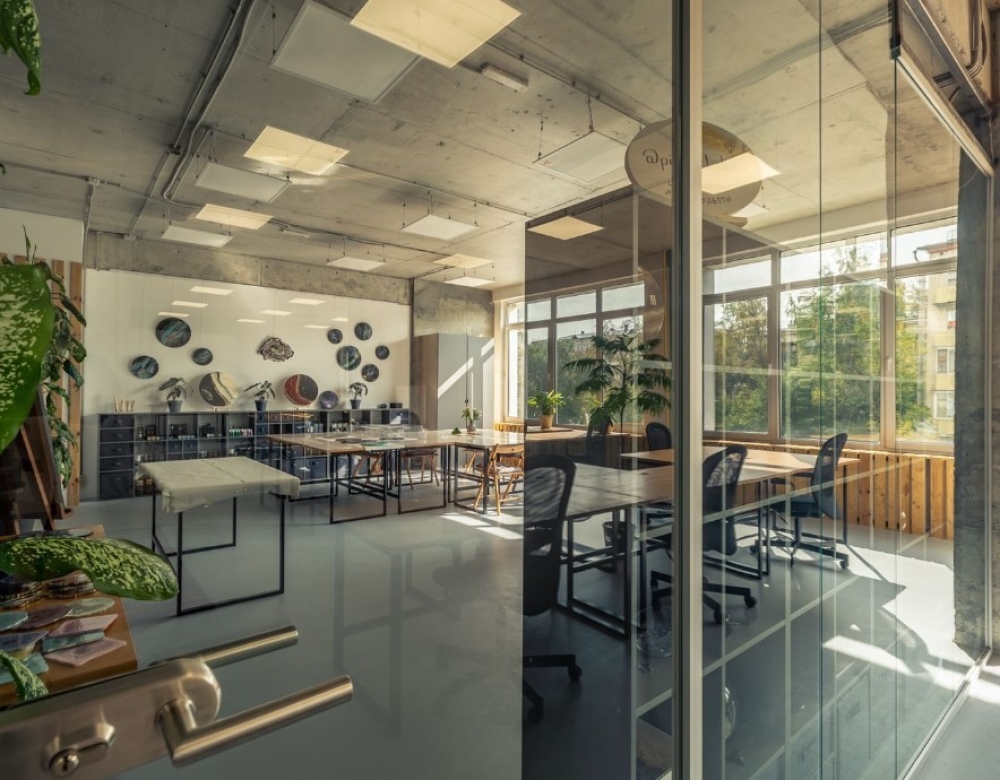 Высокие потолки (3,3 м), стеклянные перегородки и бетонные стены.