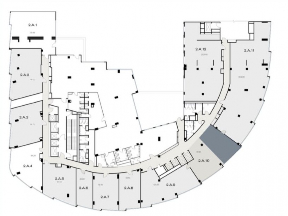 Офис площадью 131.90 м2 расположен на 4 этаже МФК, без отделки, потолки 3,30 м.