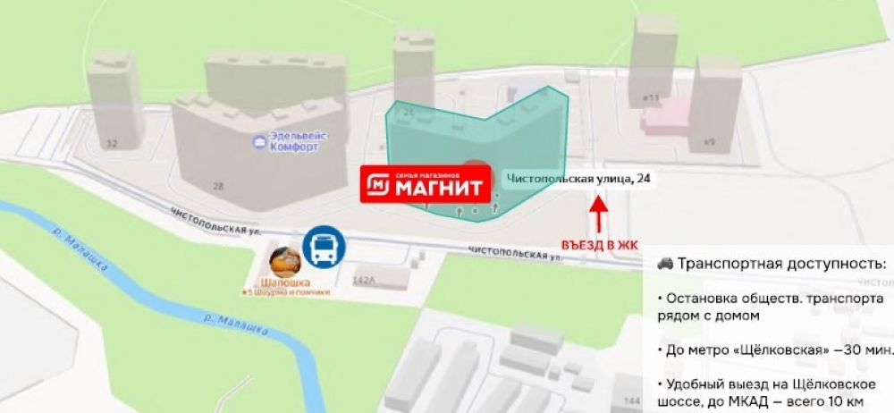 • Удобный выезд на Щёлковское шоссе, до МКАД — всего 10 км