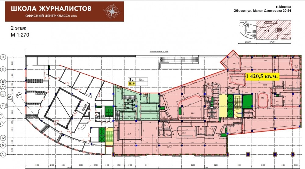 В аренду офисный блок площадью 1 420,5 м2 на 2 этаже в бизнес центре класса А "Школа Журналистов", по адресу М. Дмитровка, д. 20, м. Чеховская 5 минут пешком.