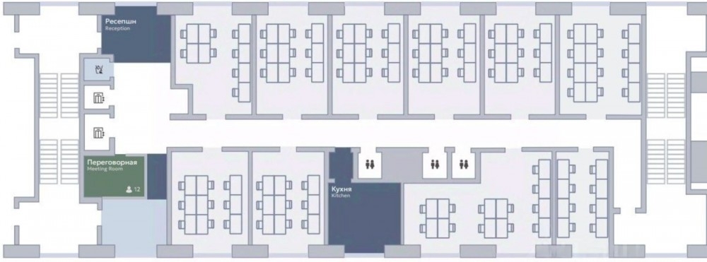 Офис рассчитан на 90 рабочих мест. Смешанная планировка, ремонт в стиле лофт и мебель. В здании приточно-вытяжная вентиляция и кондиционирование.