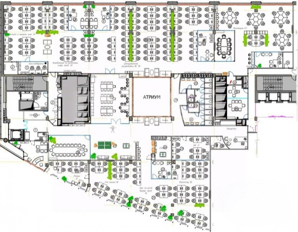 Третий этаж, много окон, стандартный офисный ремонт, смешанная планировка, приточно-вытяжная вентиляция, кондиционирование, высокие потолки.