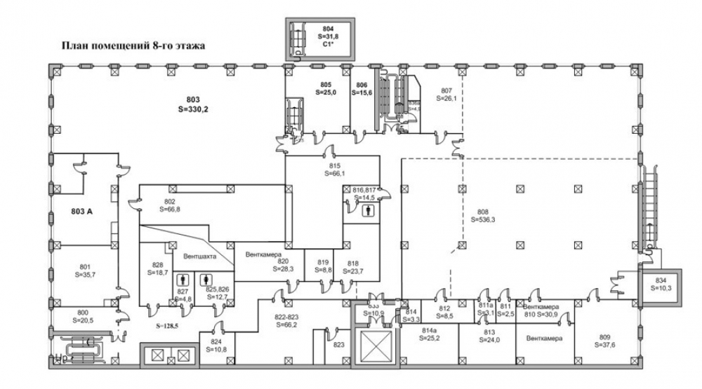 Предлагается в аренду под замену арендатора офисный блок, занимающий весь восьмой этаж целиком. Помещение будет освобождено в течение трёх месяцев после подписания договора. Дополнительно оплачиваются интернет и уборка.