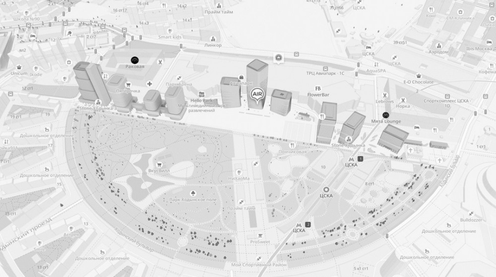 БЦ AIR имеет прямой выход на центральную аллею парка «Ходынское поле» с одной стороны и ТРЦ «Авиапарк» – с другой.