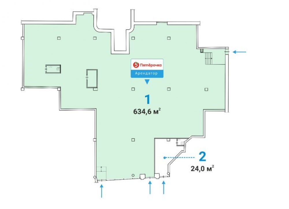 Продажа Street Retail помещения торгового или свободного назначения (ПСН) площадью 634,6 кв.м на 1 этаже жилого здания. Планировка — открытая (свободная), перекрытия — ж/б. Отлично подойдёт под любой вид деятельности: торговое помещение, магазин, ресторан, кафе, аптека, салон красоты, банк, офис продаж, кофейня и др.