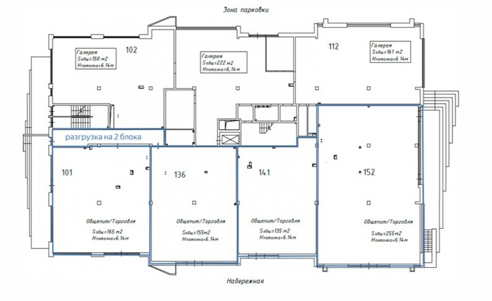 • с набережной, блоки 165м2, 155м2, 135 м2, 255 м2, высота потолка 6м, отдельный вход;