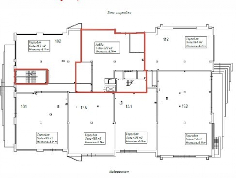 1 этаж: 222 м2 – лобби, лестница, высота потолка 6 м