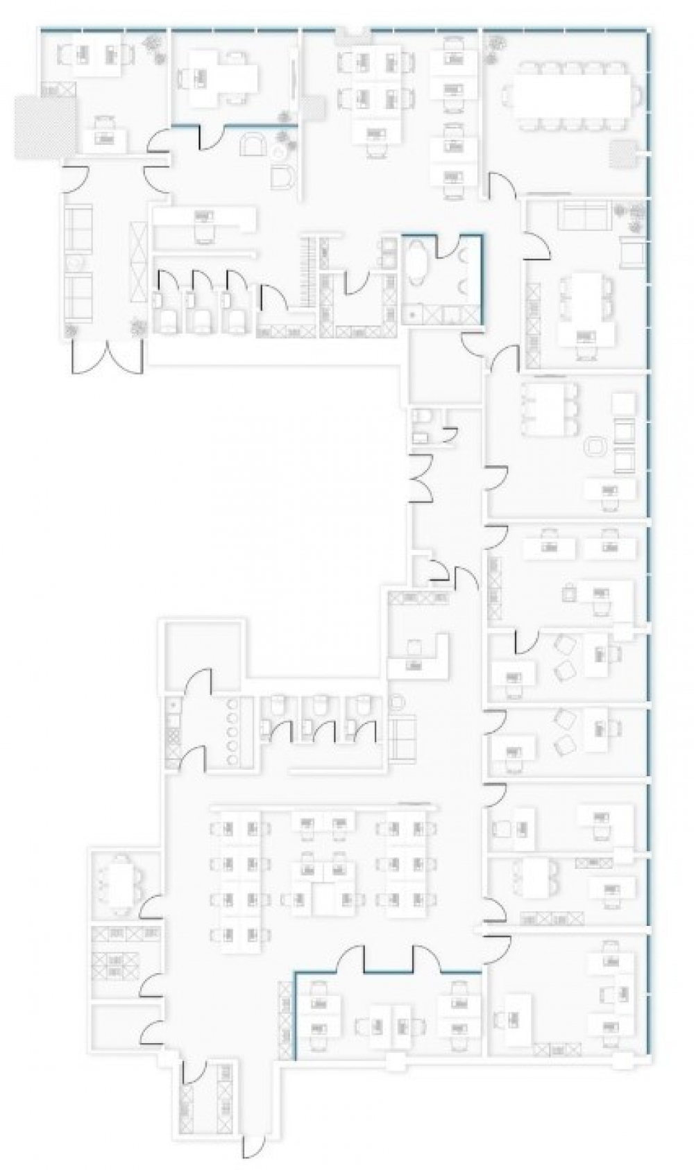 Просторный офис с развитой кабинетной системой и отдельной зоной руководителя. В офисе удобно зонировать команды по отделам и департаментам благодаря функциональной планировке: