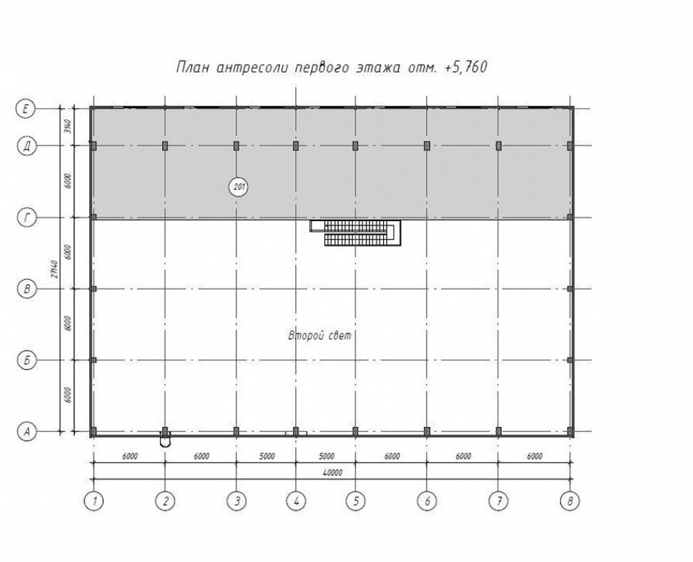 Высота первого этажа – 10 м до несущих конструкций, до антресоли – 5 м. Высота пола антресоли – 5,75 м.
