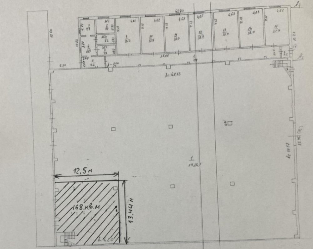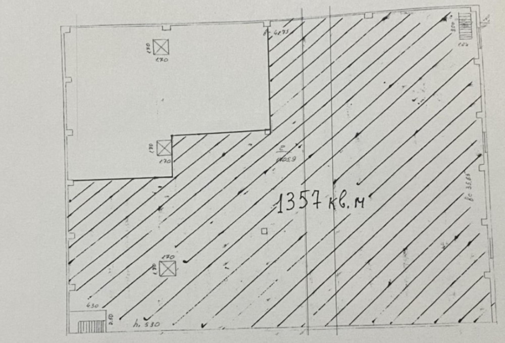 1-й этаж – 1154 м2 , 2-й этаж - 1154 м2 (24х48м), высота потолков 4-6 м, два отдельных подъёмника грузоподъёмность 1 тн каждый